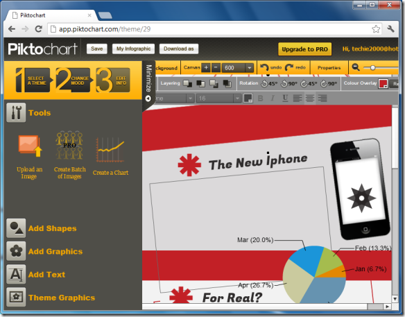 Una vez hayamos elegido el tema, abrimos la aplicación que nos aporta distintas herramientas para agregar formas, textos, gráficos e incluso insertar nuestras propias imágenes. Incluso podremos crear gráficos y lotes de imágenes en la versión Pro.